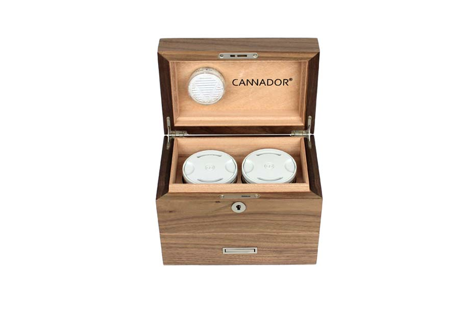 The Cannador is one of the best cannabis storage containers you can get. Aesthetically, the wooden box is simple, elegant, and discreet. Practically, the mahogany interior provides natural humidity control and resistance to swelling. The boxes come with air-tight glass cups meant to keep strains separated and that fit perfectly in the wooden box. Depending on the size (from 2 strains to 9 strains), the Cannador comes with either an additional drawer or a nook in the interior for your various accoutrements. The box also comes with a lock and two keys, which makes it just that much more secure.